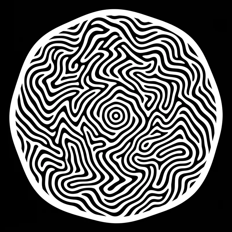 Create a black and white image depicting a geometric shape with a wavy design. This shape is symbolic, representing an idea of visceral happiness. It should be flat with no shading, emphasizing the stark contrast between the black and white elements.