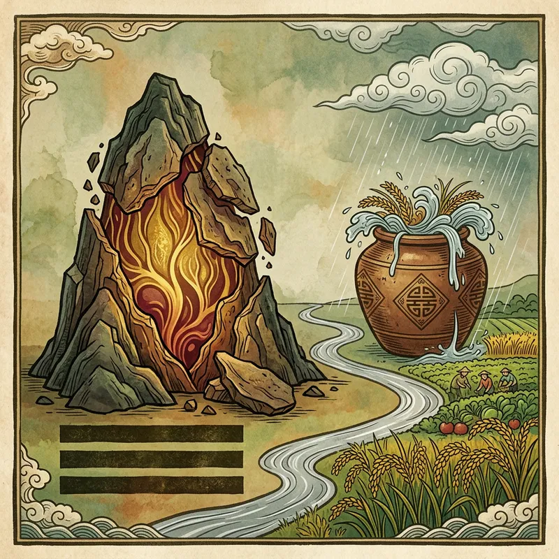 Interpret a detailed visual artwork of two Hexagrams from I Ching. The first hexagram is 'Stripping Away' which is symbolised by a mountain resting on the earth. Illustrate it being gradually chipped, sliced, and peeled away, revealing a living, vibrant core beneath. The process appears painful yet transformative. The second hexagram is 'Increasing' portrayed as an overflowing pot that signifies abundant blessings. Illustrate pouring rain contributing to a rich harvest in fields. Both the elements - 'Stripping Away' and 'Increasing' - should not be depicted as confronting but rather co-existing, indicating the fluctuating rhythms of life and transformations.