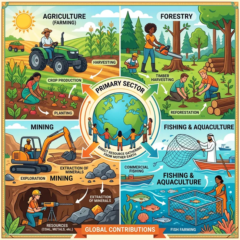 Create a visual representation of the primary sector, showing various processes involved in it. This includes activities like farming, fishing, and mining, in which resources are gathered directly from Mother Earth. Display a vibrant, multicultural mix of male and female workers of Caucasian, Hispanic, Black, Middle-Eastern, and South Asian descent participating in these activities. This represents the global contribution to the primary sector. Please add labels and arrows to illustrate the connections and flow between different activities. Use bright colors and simplified designs for better understanding.