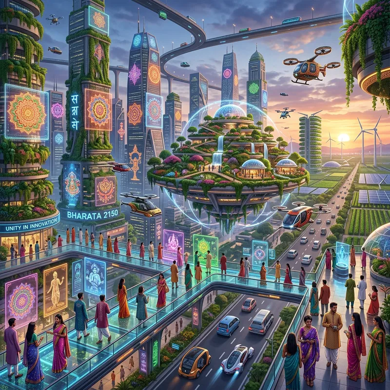 Visualize a hyper-futuristic representation of India in the year 2150, combining advanced technology, sustainable architecture, and vibrant cultural elements. Picture a cityscape with megatowers decorated with intricate holographic displays inspired by mandalas and rangoli. Eco-friendly skyscrapers with cascading vertical gardens dominate the skyline. Autonomous vehicles with a mix of traditional and futuristic designs move along smart roadways. Pedestrian walkways have interactive augmented reality installations. Central to the city is a colossal floating garden using anti-gravity technology, surrounded by transparent domes containing futuristic marketplaces. The city outskirts have vast agricultural lands with vertical farming towers, wind turbines, and solar panels. The populace wears high-tech traditional Indian attire with augmented reality contact lenses. This scene embodies unity, where technology meets tradition.