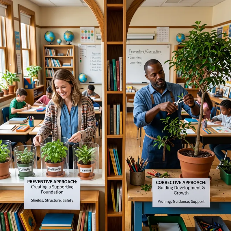 Create an image that metaphorically illustrates the concept of preventive and corrective approaches in education. On the left side, show a teacher (Caucasian female) placing protective shields around growing plants (symbolizing students) to represent preventive measures in education. On the right side, depict another teacher (Black male) attentively pruning a tree, symbolizing corrective actions taken to nurture student development. The background should be a classroom setting, filled with different educational tools. Make sure to highlight the essence of both approaches, prevention as a means of creating a conducive learning environment, and correction as a way of guiding educational growth.