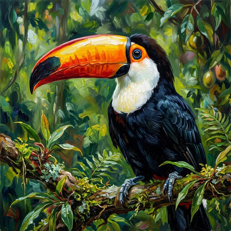 A high-resolution 4k oil painting portraying a vivid close-up of a Toco Toucan. The bird is perched on a branch, showcasing its strikingly unique beak and a burst of colourful feathers in a nature-inspired setting. The imagery focuses on detailed textural elements, using bold and vibrant colours to highlight the bird's distinctive features.