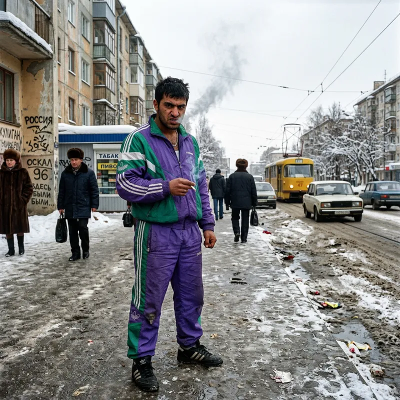 Vivid 90s Street Scene in Russia: Menacing Bully in Purple Tracksuit