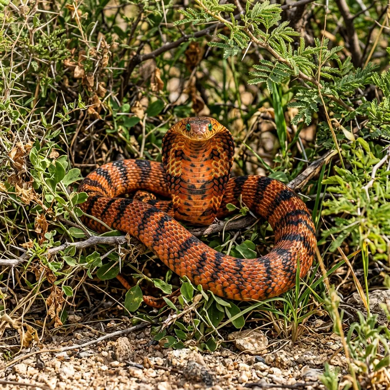 Depict a vivid, life-like scene of a snake nestled within the dense foliage in its natural habitat. The snake should specifically be a desert cobra, coiling tightly yet gracefully, its scale pattern a complex design of alternating red and orange hues. Its piercing eyes should be glowingly emerald, its hood expanded in a show of defensive stance. The foliage around it shimmers with vibrant green tones, and the ground is a coarse layer of pebbles and sand, indicative of a desert environment.