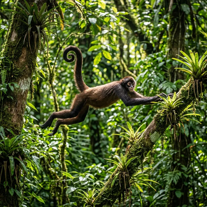 A splendid and vivid image of a monkey. This agile, curious creature is found in the heart of a dense rainforest. It's covered with short, sleek fur that glistens in the dappled sunlight filtering through the lush canopy above. Its small ears are perky, eyes lively with intelligence. The monkey is captured mid-jump, soaring from one magnificent tree to another, tail curled for balance. Long limbs stretch out, reaching for the next sturdy branch while a cheeky grin spreads across its face, embodying the monkey's playful nature.
