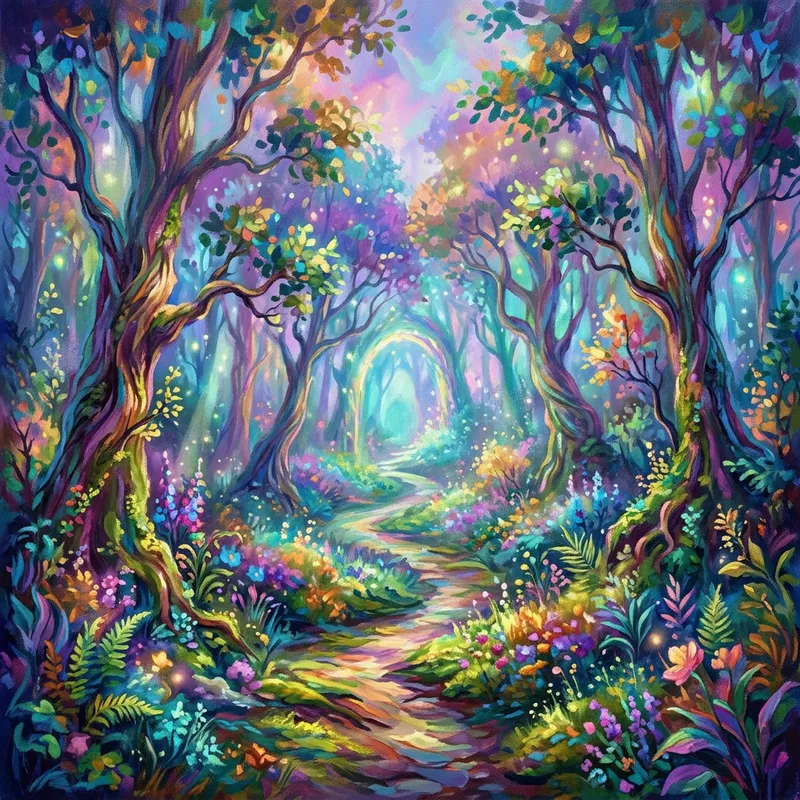 A mystical forest vividly painted with bright, dreamy colors using impressionistic brushstrokes. A hidden path weaves its way through the woodland, inviting curiosity as it leads into the unknown. The out-of-this-world and ethereal atmosphere is amplified by a tapestry of intermingling shades, unique to a digital painting aided by delicate, exploratory brushstrokes, inspired by the enchantment of fantasy literature.