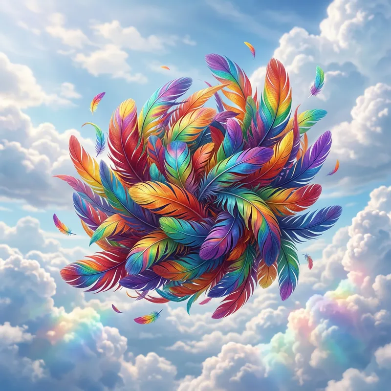 Imagine a cluster of intertwined feathers floating serene and free in the sky. Each feather is distinct, each one holding its individual beauty, and together they form a large bundle that is vivid and stunning. Its theatrics are enunciated by the stunning blend of rainbow patterns running through each plume. From the reds to the purples, each color is stunning and offers an otherworldly appeal. This feather bundle resides not alone, but in the company of an idyllic setting - a sky filled with fluffy white clouds reflecting the lovely hues of the colorful feathers.