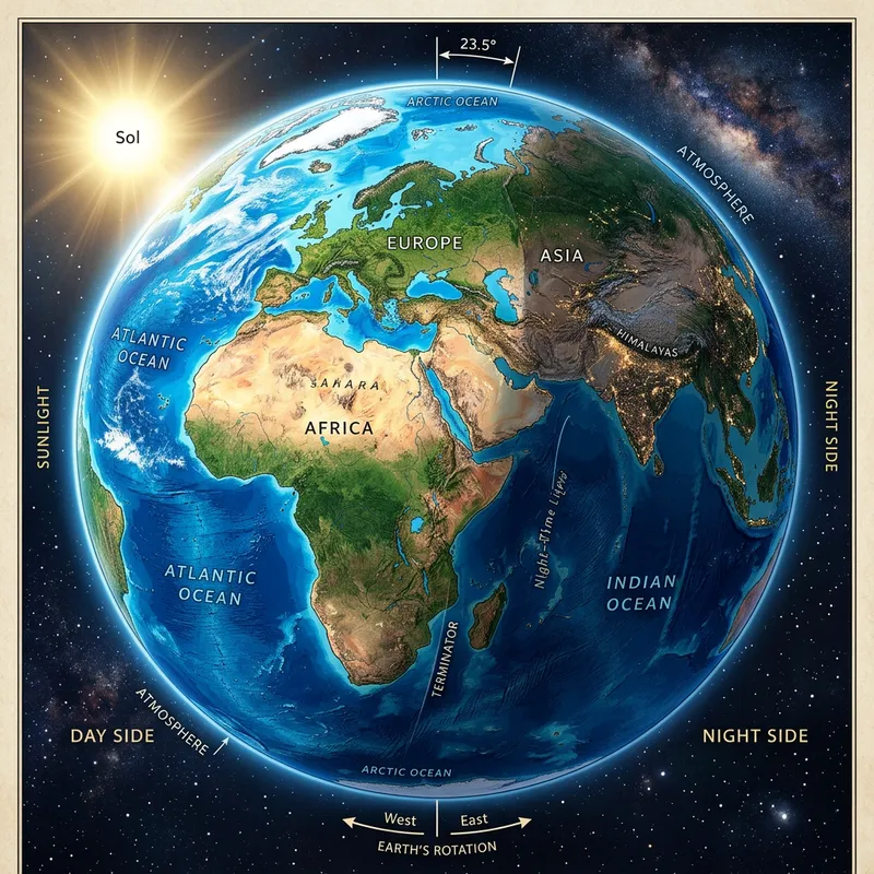 A highly detailed scientific illustration of Earth. Circle shaped, it is a vibrant representation of our blue planet, with shades of blue for the wide expanse of ocean, different hues of green and brown for vast land masses showcasing forests, mountains and deserts. Small white patches denote clouds hovering over different areas. Illuminated by the sun, a part of the Earth is brightly lit while the other half falls under shadow, representing the concept of day and night. Such illustrations typically help in understanding geographical, climatic and astronomical aspects tied to the planet Earth.