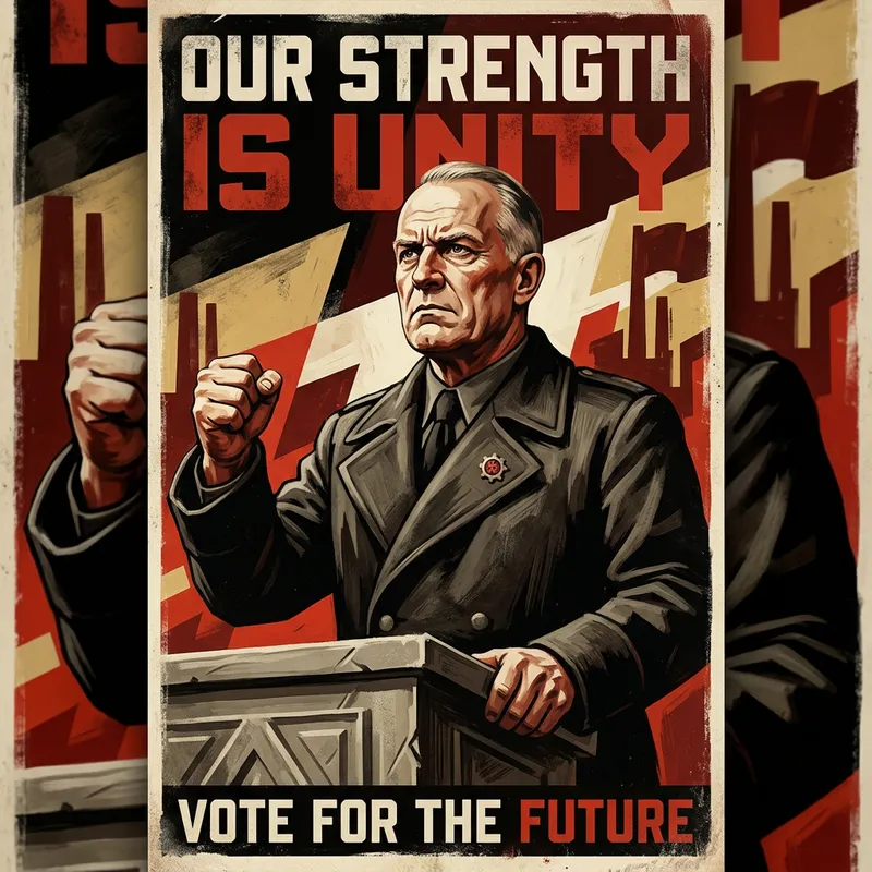 An iconic poster featuring a stern, authoritative politician, done in the style of historical propaganda art. The image should use bold colors and strong contrasts to emphasize the character's intensity. The subject should have a stern facial expression, signifying their commanding presence. The artwork should be a digital painting with evident dramatic brushstrokes, indicating a political theme.