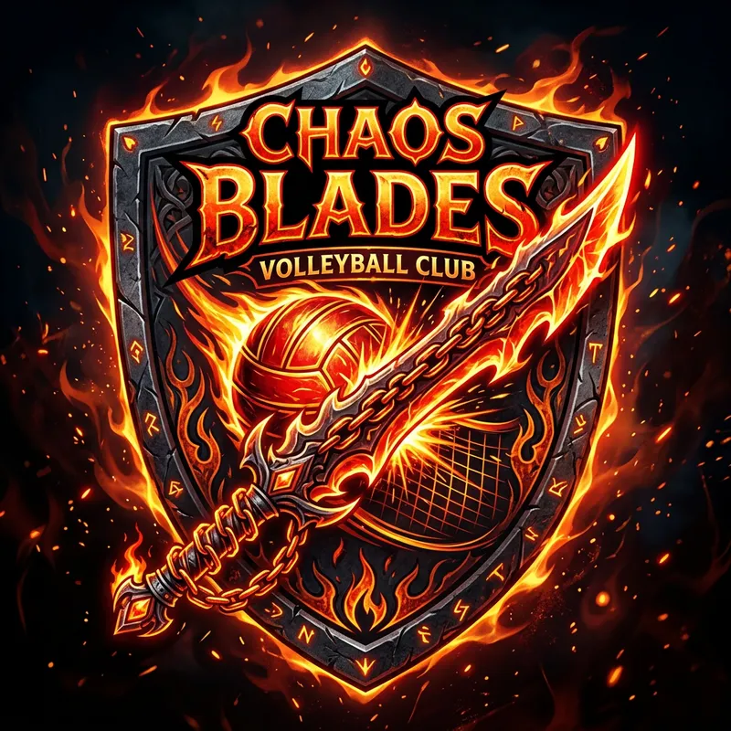 Design a logo for a volleyball team that incorporates elements inspired by an ancient mythical chaos blade. This blade is from an old tale filled with gods and heroes, it has a fiery red glow and it's made of chained knives. Make sure to integrate this into the design along with volleyball representing symbols.