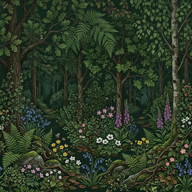 a wallpaper featuring a dark green background with elements of nature such as trees, plants, and flowers
