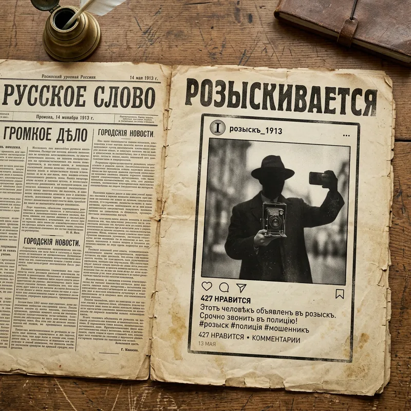 An image of an old newspaper with a 'wanted' inscription in Russian. There is an Instagram frame with a silhouette of a person. This person is depicted taking a selfie with a camera.