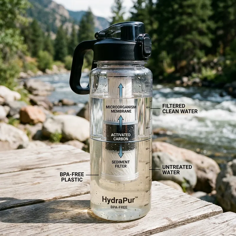 Visualize a crystal clear, reusable water bottle made of durable, BPA-free plastic material. It has a built-in purifier, visible as an intricate cylinder in the center of the bottle. The purifier has multiple stages of filtration with separate layers for sediment, carbon, and microorganisms. The device is in the process of filtering some water, leaving the top half of the bottle filled with clean, potable water, and the bottom half with untreated water. The bottle is sleek with a secure, leak-proof lid, complemented by a sturdy, easy-grip handle for convenience.