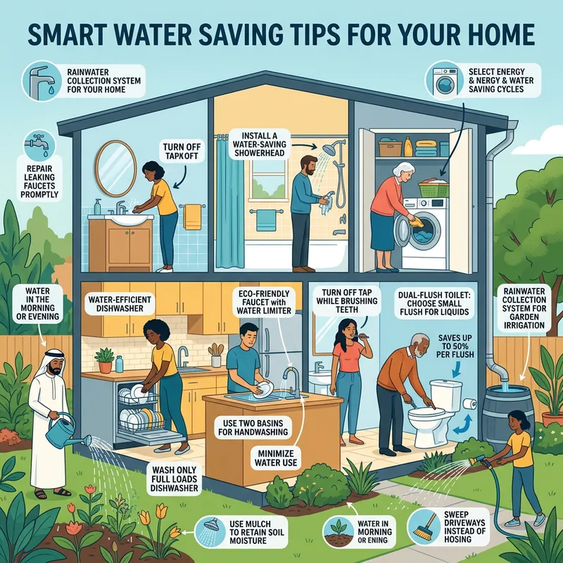 An informative illustration for saving water within the home, containing elements such as eco-friendly faucets with water limiters, dual-flush toilets, rainwater collection systems, and water-efficient home appliances like washing machines and dishwashers. The image also shows people of various genders and descents practicing these water-saving habits in different parts of their house. They could be shown turning off taps while brushing their teeth, collecting rainwater for gardening, handwashing dishes with minimal water, and doing full loads of laundry. Tips and tricks for water conservation should be illustrated within the scene.