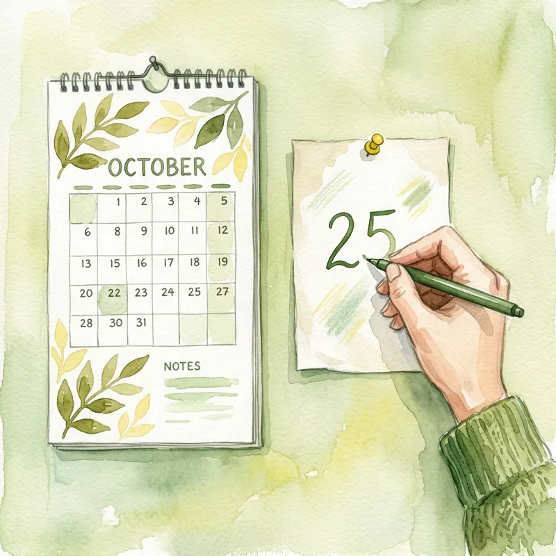 A calendar hanging on the wall, a hand with a pen is writing the number 25 on a piece of paper next to it. The scene is featured in green and yellow colors, depicted with the texture of a watercolor painting.
