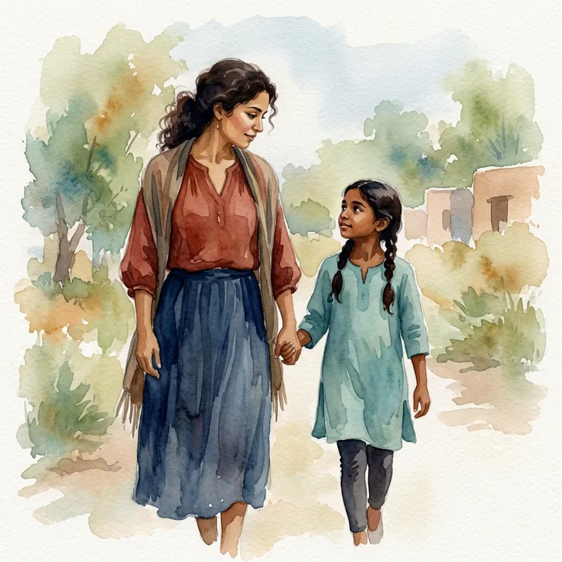 A painterly scene in the style of a watercolor painting. The main subjects of the painting are two distinct figures: a woman, of Hispanic descent and her daughter, of South Asian descent. They both exhibit heartwarming features of their ethnic roots. They don't possess detailed facial features or intricate clothing patterns, as the style is more focused on their outlines. Instead, their forms and silhouettes define their persona. Also, the relationship between them, a mother and her daughter, should be identifiable through their positions and interactions. The entire image should evoke a sense of careful brushwork and natural subtlety common in watercolor art.