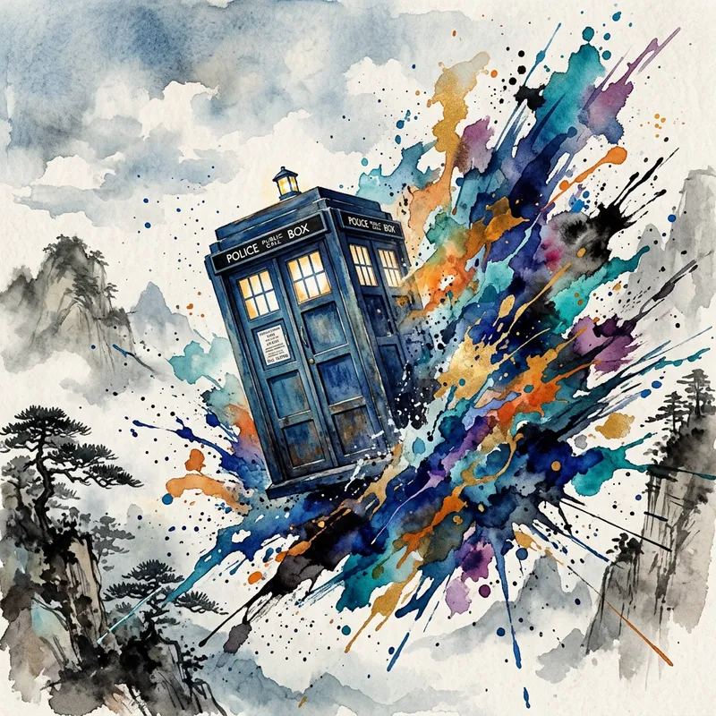 Generate a wallpaper-worthy image of a quintessential British time machine, reminiscent of a popular Sci-Fi series, bursting through a splash of paint, executed in a watercolor style, akin to the inky aesthetics of traditional Chinese painting.