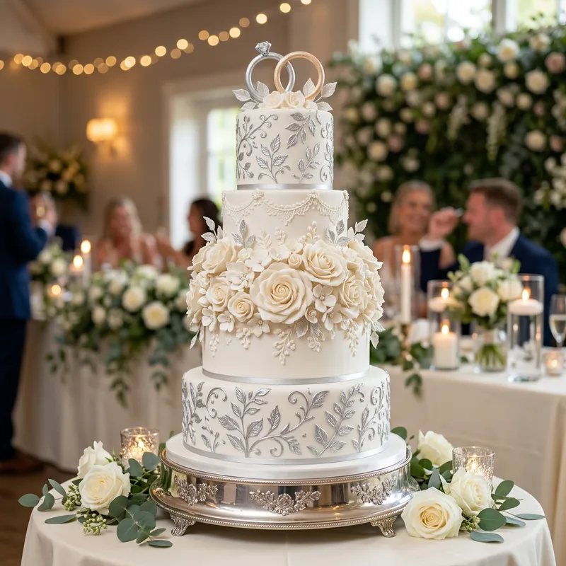 An exquisitely decorated wedding cake with elegant white frosting and intricate piping. The cake boasts multiple tiers each with varying designs and textures. Roses carved from icing decorate the middle layer while an edible silver foliage pattern ornaments the top and bottom layers. The finishing touch is a delicate, handcrafted sugar topper of intertwined rings, symbolizing the union of the bride and groom.