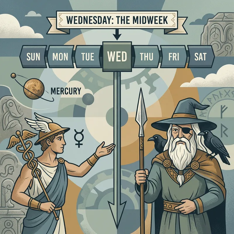 A visualization of the concept of Wednesday, represented as the middle day of the week, with symbols traditionally associated with this day, such as the planet Mercury and the Norse god Woden, from which the English name of the day derives. The imagery consists of predominately midtone colors and balanced compositions to signify a midpoint.