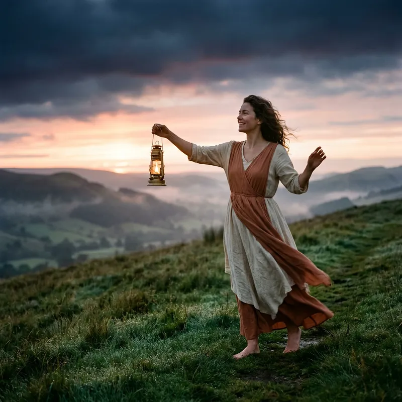 An image of a person holding an oil lamp in their hand, welcoming the first light of a new day. She is standing outside with misty hills in the background, the remnants of the night sky slowly fading away to welcome the soft hues of dawn. Dew drops glitter on the grass beneath her feet. Dressed in a flowy garment, an expression of hopeful anticipation on her face, she stretches the oil lamp towards the east, the direction of the rising sun, as though inviting the brightness with open arms. A slight breeze is playing with the flame in the lamp but does not extinguish it.