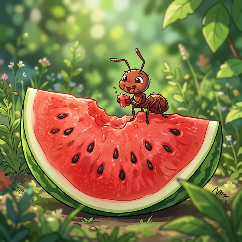 Generate a whimsical illustration featuring a small, jubilant ant delightfully nibbling on a slice of watermelon. The image should reflect a macro photography style with a shallow depth of field. The ant's antics must be playful, attributing an element of charm and humor to the scene. Emphasize vibrant colors and playful textures throughout the illustration, making the ant and its activity eye-catching and humorous. The rendering style for this depiction should be in cell shading, commonly used in digital art to create a flat yet dimensional visual appeal.