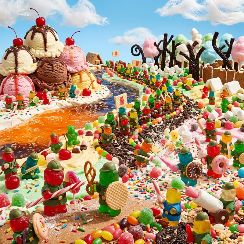 Render an ironic scene of war, where the warriors are anthropomorphic gummy bears. The gummy bear soldiers each wear miniature military uniforms and their weapons are made of confectionery items like candy canes and lollipop shields. The battleground is set in a surreal landscape made entirely of desserts - hills of ice cream, rivers of soda, and forests of licorice twist trees. Some gummy bear soldiers are depicted locked in lighthearted combat, while others march jellybean-studded paths. It is a spectacle of whimsical intensity, underlining the irony of the concept.