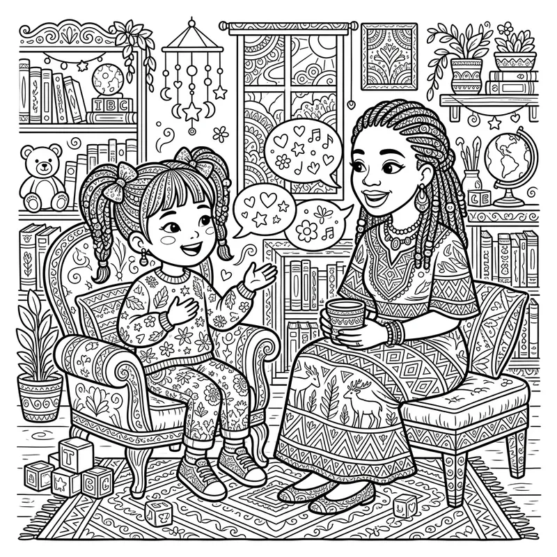 A coloring page illustration in a whimsical cartoon style featuring a small child of East Asian descent having a vibrant conversation with an adult of African descent. Both figures are entirely outlined in black and white, ideal for coloring. They are embellished with intricate detailing to allow for a fun and creative coloring experience.