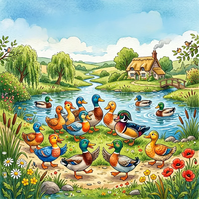 A banner showcasing a grouping of brightly hued ducks portrayed in a charming and jovial style. The colors are vibrant and elicit feelings of cheerfulness. The image quality will be of a high resolution leading to crisp details. The style draws inspiration from the quaint and endearing animal illustrations, characteristic of English children's authors and illustrators from the late 19th and early 20th century. The art form is digital painting making use of gentle brushstrokes that highlight the essence of nature.