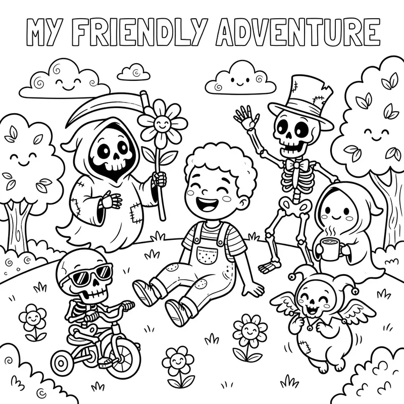 A black and white coloring book page featuring a scene where a child of undefined gender and race is surrounded by whimsical caricatures of the concept of death. These characters should have thin outlines and exaggerated facial expressions, embodying a more fun, cartoon-like nature rather than a dark or scary feel. Despite the theme, the image should still remain child-friendly and light-hearted.