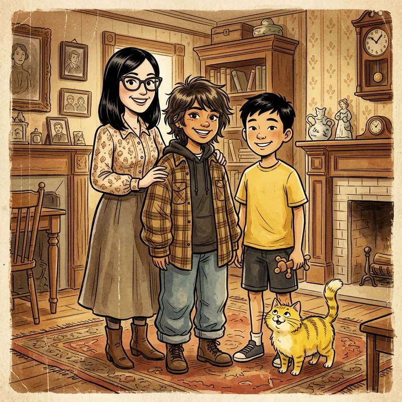 Generate a whimsical image in a style reminiscent of pre-1912 animated films. Picture a caucasian woman with mid-length, straight black hair and trendy, rock-style glasses. Standing next to her are her two children - her son, an Asian teenager with short hair, dressed in a yellow t-shirt, and her daughter, a Hispanic 15-year-old girl with layered short hair, wearing oversized clothes. Also in the scene, include a yellow cat. The setting should reflect a cheerful and familial atmosphere.