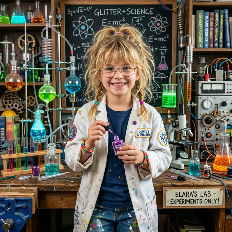 A character with a similar appearance to a well-known cartoon genius boy, but this character is a girl. She has blonde hair and holds a nail polish in her hands. She is in a setting reminiscent of a whimsical laboratory filled with various scientific apparatus.