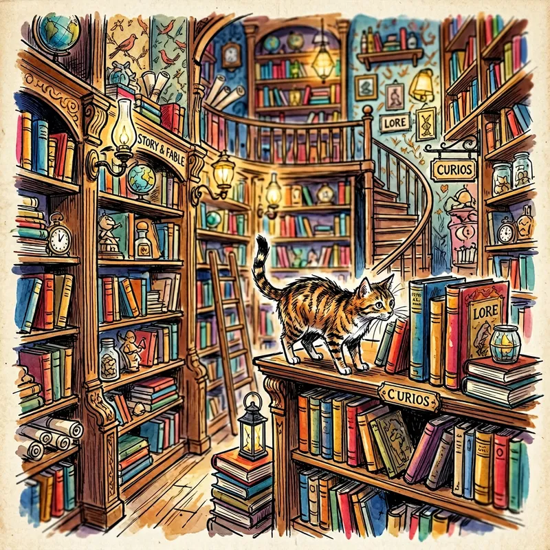 Gestural Brushstrokes: Whimsical Library with Curious Feline