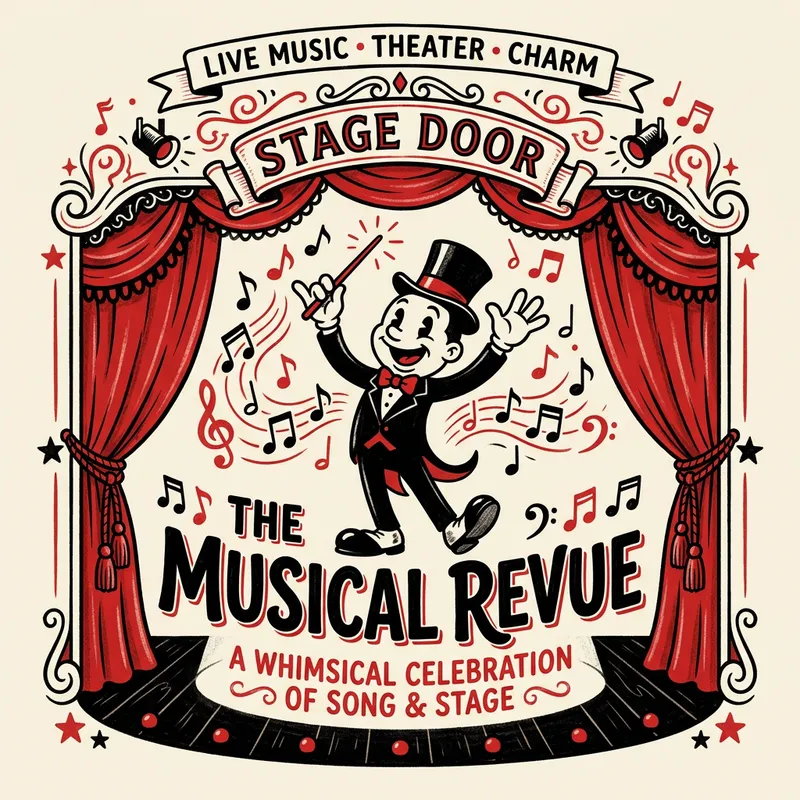 Generate a logo for a music-themed event. The logo should evoke the whimsical charm associated with classic animation but should not directly refer to any copyrighted characters. The colors should be black and red, and it should incorporate elements reflecting the ambience of a theater. Visual cues to suggest the essence of theater could include stage curtains, musical notes, a director's chair, or a spotlight.