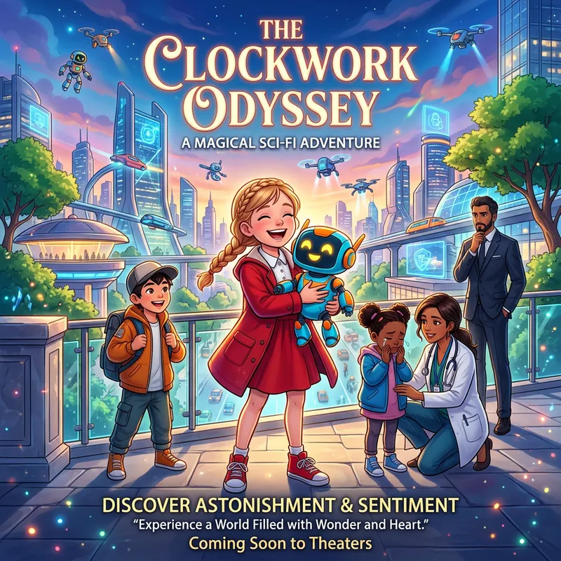 Create a whimsical movie poster featuring a gleeful young Caucasian girl in a white shirt, red coat, red dress, and matching red shoes, holding a small robot with expressive eyes. The setting is a futuristic city filled with modern buildings, flying robots, and drones. There's also an Asian young boy in a cap, granting an adventurous outlook, and an African American girl crying, suggesting an emotional plot. A female Hispanic doctor with a caring gaze hints at a poignant part of the story, while a Middle-Eastern man in a business suit adds mystery. The poster evokes a warming yet mysterious sci-fi adventure. The imagery presents digital art with smooth brush strokes and brilliant colors, bringing the futuristic cityscape and green trees to vibrancy. A touch of luminescence gives it a magical aura. With a fusion of anime-style and futuristic themes, this comes to life, preparing you to experience a world filled with astonishment and sentiment.