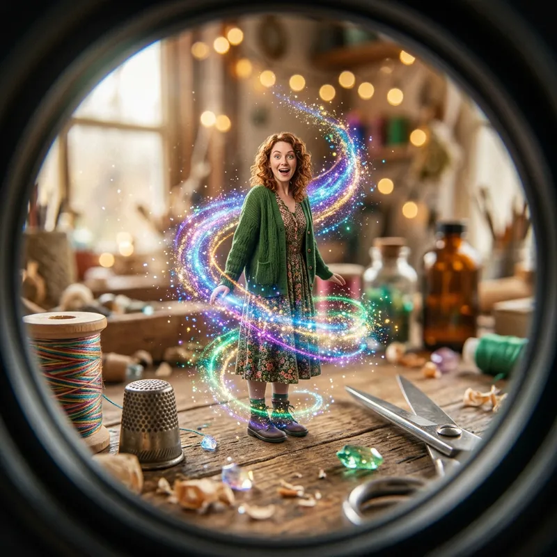 Imagine the colorful scene of a small Caucasian woman magically decreasing in size through a powerful lens. The scene is aesthetic, accentuating the perspective akin to macro photography. The woman's whimsical expression is caught in the act of transformation, amid a swirl of vibrant colors capturing the movement in high detail. Everything is captured as though through a high-quality camera lens, akin to the level of clarity offered by equipment like the Canon EOS 5D Mark IV.