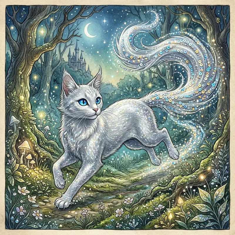 Create an image of a whimsical white feline creature with a gleaming silver coat. The coat is dusted with specks of glitter and it has captivating blue eyes. Its tail is like a magical stream of sequins. Please generate the image in a fantastical, full-length animation style, reminiscent of early 20th century fairytale illustrations instead of specific studio styles. Render the image in high detail, aiming for a quality equivalent to an 8k resolution.