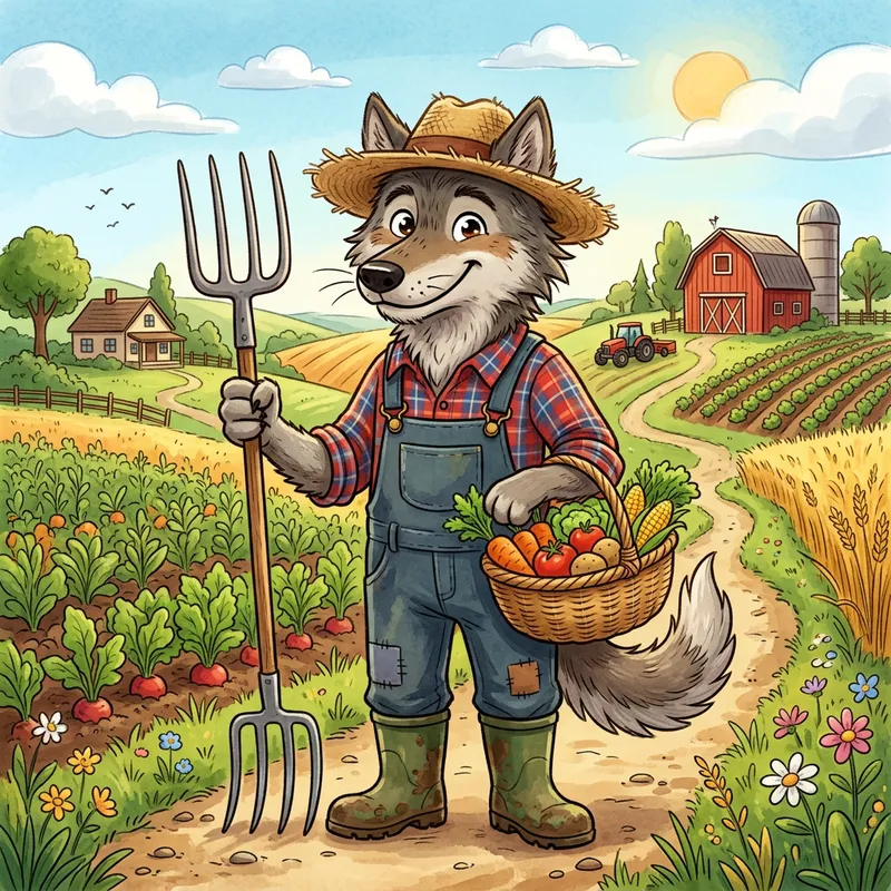 A whimsical, cartoon-style illustration of a wolf dressed as a farmer. The wolf has a snout and a shaggy fur coat, showcasing traits reflective of its wild nature, yet its eyes sparkle with good-natured humor. The farmer outfit consists of a straw hat, a plaid shirt, overalls, and rubber boots. The wolf holds a pitchfork in one clawed paw and a full basket of fresh farm produce in the other. Set in a rural background, rolling hills and fields of crops forming a vibrant backdrop.