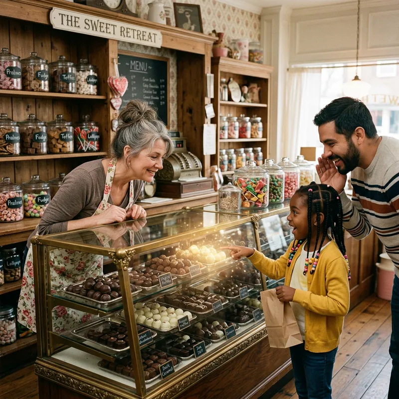 Imagine a whimsical scene inside an old-fashioned sweets shop. There are three people of different descents: a Caucasian woman, a Hispanic man, and a Black child. The woman, the candy store owner with a friendly smile, leans over to whisper something to the large variety of chocolate candies elegantly displayed in the glass counter. To the side, the man and the child, both customers, are enthusiastically whispering amongst themselves, their eyes wide with delight as they gaze at the delicious treats. Their cheerful whispers seem to be infusing magic into the chocolate, making them glow subtly. The air is filled with the nostalgic scent of chocolate and the warmth of whispered secrets.