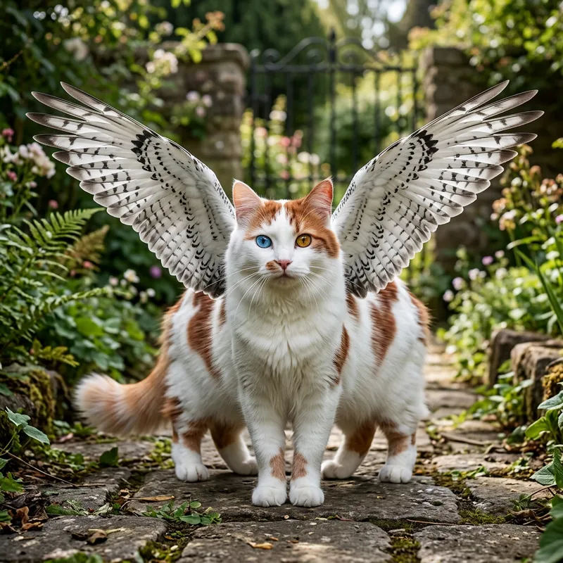 An ultra-realistic full-body portrayal of a white cat with red patches. The cat has a pair of wings that are white with black details. Its left eye is a bright blue, while its right eye is a golden hue. Both of its eyes have star-shaped pupils.