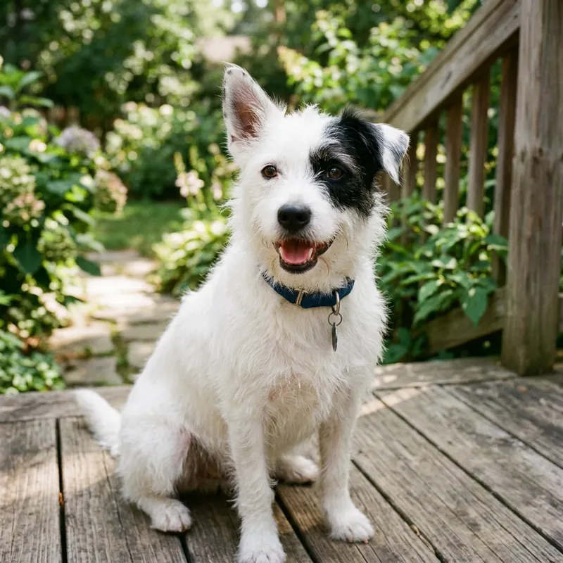 Original Prompt: Un perro blanco con mancha negra en el ojo