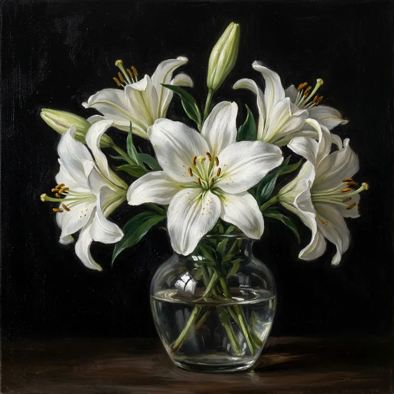 A delicate arrangement of white lilies nestled into a glass vase, set against a stark black background. The scene draws inspiration from the grace of impressionism, highlighting the soft brushstrokes and rich color palette that hails from the era. The detailed petals showcase the precision a macro lens would provide, intrinsic to the creation of a floral still life. This image captures the ethereal beauty of the lilies, reflecting the subtlest of details as would be captured by a Lumix GH5 camera.