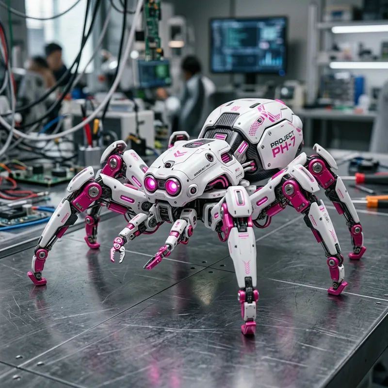 Original Prompt: arañas robótica blanca con detalles rosas