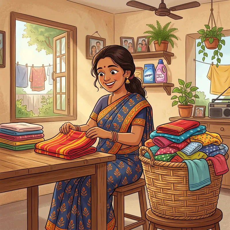 Wholesome South Asian Mother Cartoon - Laundry Day Serenity