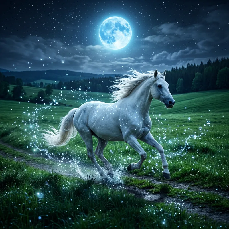 A white wild horse, its mane fluttering in a breeze, runs energetically across a landscape imbued with water magic. Beads of water twinkle and float around the horse, creating a sense of surreal beauty. The background is an expansive green meadow, rich and vibrant even under the ethereal glow of the moonlight. The blue moon in the sky sheds its soft luminescence on the scenic vista, adding depth to the picture. The scene elicits a sense of freedom, tranquility, and the magic of nature.