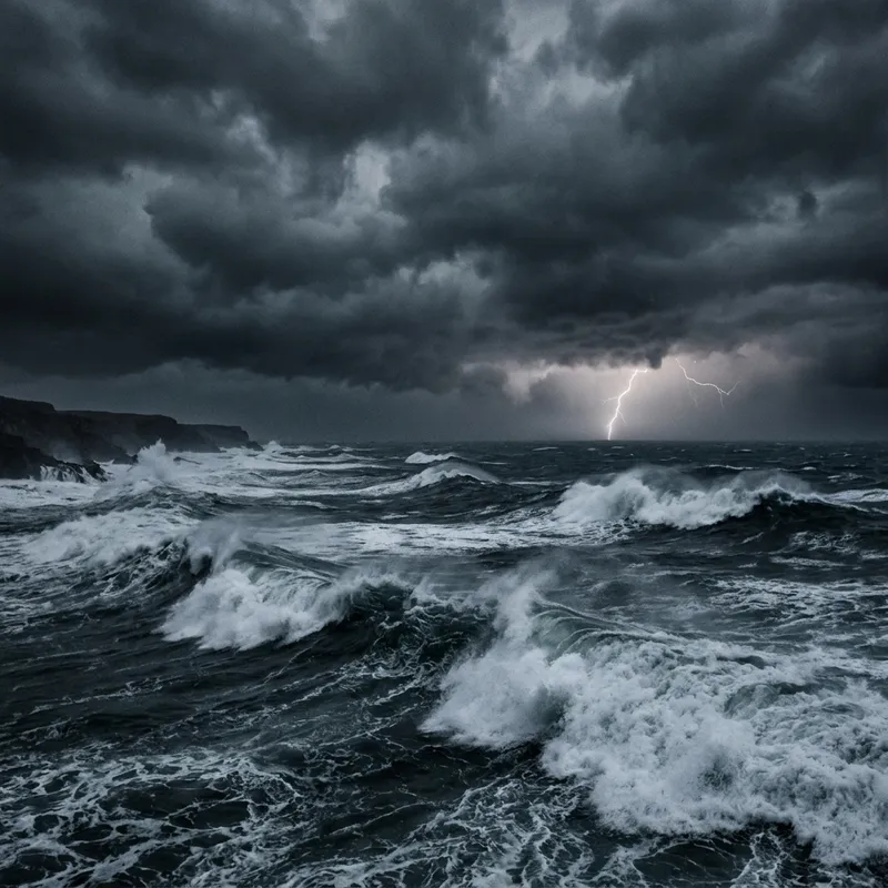 A turbulent ocean scene where powerful, moody gray clouds loom overhead, indicating an approaching storm. The sea underneath these threatening clouds is far from calm, with gigantic, white-capped waves fiercely crashing onto each other. The atmosphere is intense and full of raw, natural energy, while in the distance, occasional flashes of lightning break through the clouds, momentarily illuminating the wild seascape. The scene is absent of human activity, emphasizing the sheer magnitude and untamed force of Mother Nature. The overall color palette is dark and gloomy with heavy use of blues and grays.