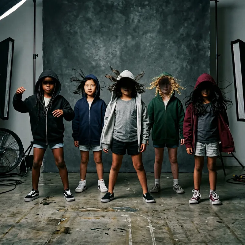 Five little girls of various descents, their faces hidden in shadows created by their hoods, are striking poses in a professional photographic studio. Each one is wearing an oversized, unzipped hoodie that is being animated by an artificial breeze, along with a t-shirt underneath and shorts. Their hoods are pulled up over their heads, casting their faces into mystery, and their diverse hairstyles are seemingly caught in a freeze-frame of movement due to the manufactured wind. The atmosphere itself speaks of a modern, dramatic, and slightly windswept photoshoot.