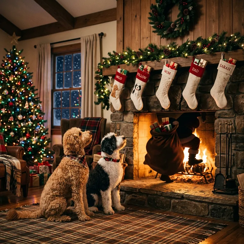 Create an image showcasing a winter's Christmas scene. There is an apricot Goldendoodle and a Sheepadoodle. Both are comfortably seated, their ears perked up in anticipation, while they are in front of a crackling fireplace that casts a warm and inviting glow across the room. The stockings are hung with care on the mantelpiece, filled to the brim with goodies. Suddenly, on the roof, soft thuds and scuffles indicate someone's arrival. In the dimly lit room, a silhouette is noticed, steadily coming down the chimney with a sack full of presents. It is Santa Claus, making his holiday rounds.