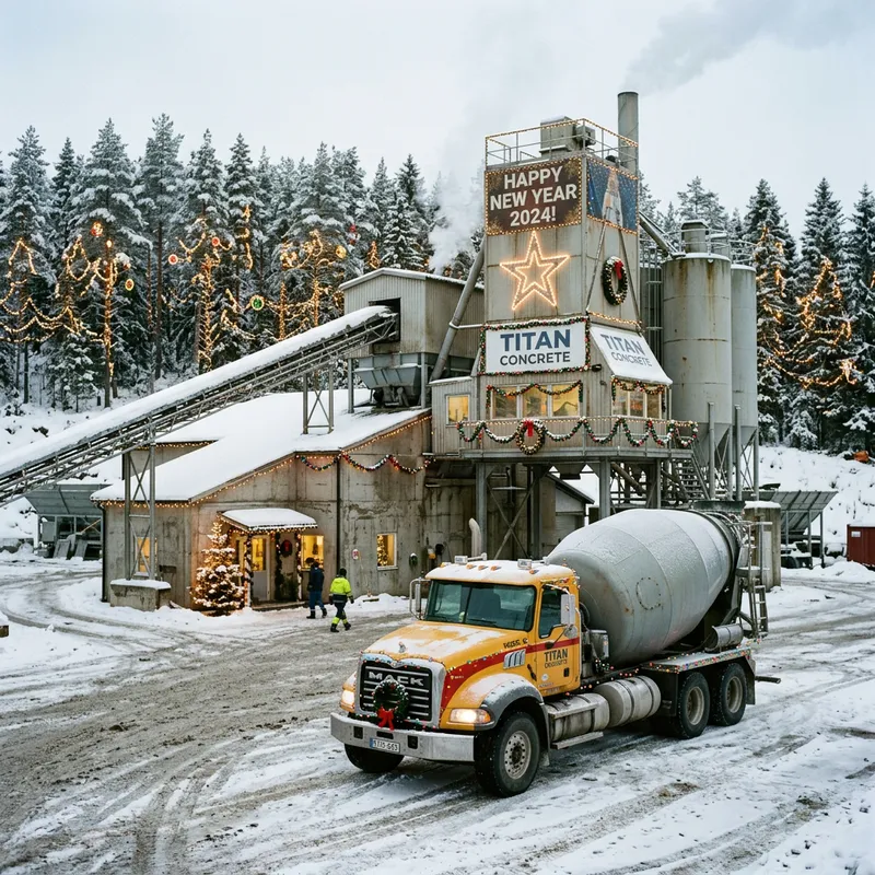A detailed image of a concrete factory in the midst of a chilly winter season. The building is adorned with festive decorations celebrating the new year, giving an intriguing contrast between the industrial setting and the cheerful atmosphere. Nearby, a robust concrete mixer truck stands idle, its tough metallic surface glistening in the soft winter light. Bordering the scene is a peaceful forest, with tall pine trees majestically rising towards the sky, their branches gracefully decorated with twinkling Christmas lights forming radiant garlands. The combined effect gives an unusual but charming impression of holiday cheer in an otherwise industrial setting.