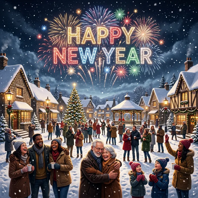 An idyllic winter scene with snow gently falling on a small, quaint village. The streets are illuminated by warm, glowing street lamps. A diverse group of people is gathered at the village square, all decked in winter clothing. Some of them are sharing a laugh, others are gently embracing each other, conveying the spirit of unity and celebration. On the sky overhead, a massive display of multicolored fireworks are exploding, spelling out 'Happy New Year'. The whole scene evokes a strong sense of joy, togetherness and positivity as humanity steps into the new year.