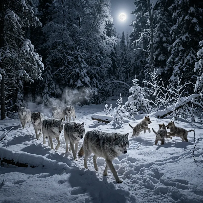 A pack of wolves in a forest during winter. The wolves are wandering through the thick snow, their distinct gray and white fur blending with the snowy landscape. There are young wolves playfully frolicking amidst the snow-covered trees while the adult wolves attentively watch their surroundings. They breathe into the cold air, resulting in clouds of fog. The moonlight illuminates their path, contrasted by the dark shadows of the trees. The scene portrays the beauty of wilderness and the raw, striking, yet harmonious life of wolves in their natural habitat.